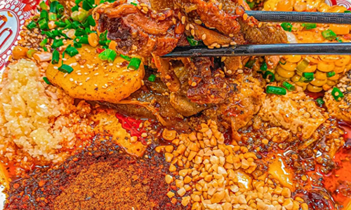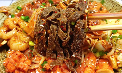 油黑的木耳、翠綠的青筍、雪白的豆腐、滑嫩的牛肉,多種多樣的食材在湯鍋中隨著湯汁翻滾,竹簍輕松的鎖住每一份美味,湯汁搶著從竹簍的空隙中逃回鍋中,被放入盤中食材裹上辣椒面、蒜蓉、香油組成的外衣,散發著寧人著迷的香味,這就是成都的味道,干拌冒菜。